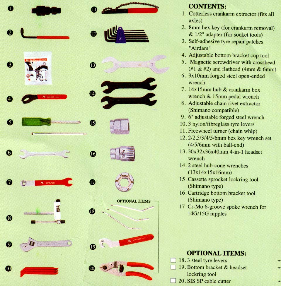 | 2 クランクアーム取り外し用8mmアーレンキー | 6 9mm×10mmスパナ | 10 タイヤレバー | 14 ハブ用レンチ | オプションは未購入 |