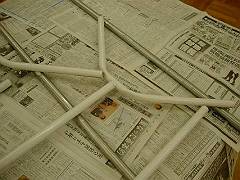 最初にパイプ(綿半ホームエイドで購入、3.3mで348円)を曲げる作業。熱しておいて熱いうちに曲げるが、金工用の万力などがないために外の壁と雨水管の間に挟み込んで曲げた。