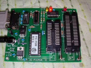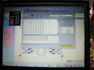 書き込みソフトの画面。下は、PICライター。USBで接続してソケットにPICマイコンを差し込み(下の写真で右から2番目のソケットに18ピンのPIC16F84Aがさしてある)書き込みボタンを押すと、書き込まれる。