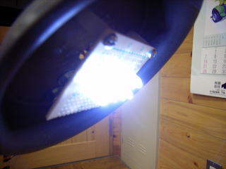 コの字型に曲げたアクリル板の中間あたりに、L字型に曲げたアクリル板をランプの首を止めるボルトで一緒にねじ留めした。