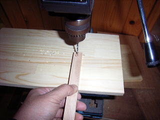 材料は2年前に使った1年生の木工でのあまり材(テーブルの天板を切った端材)。それを2組の2辺に切った。 表面は軽くベルトサンダーをかけて、片方に3mmのドリルで穴を開ける。 6mmのドリルで座ぐりをした後、もう一枚に木ねじで留める。
