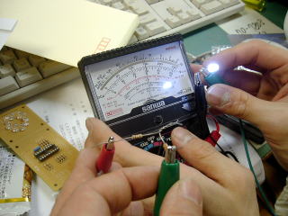 公開授業を行った日、夜箕輪中によってそんな話をしたら、T先生が早速回路を組んでくれたので、テスターにつないでもらって色々換えて試してみた。