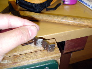 今まで全く気づかなかったけれど、時計のバンドにはピンを抜く方向に矢印が入っている。 小さな真鍮釘を打ち込んで抜き取った。 抜いたコマと割ピン。つなぐときは矢印の反対側から差し込んでハンマーで打って留めた。 無事に使えていてありがたい。