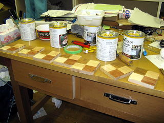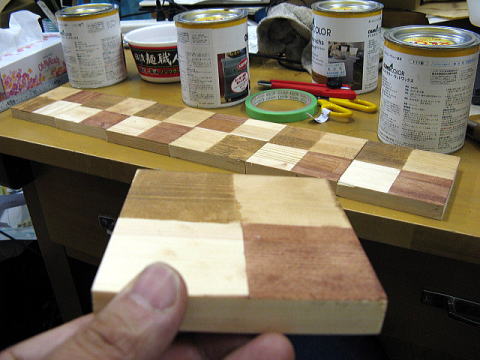 パインと、チークと、マホガニー。もう一カ所は塗装無し。かなり薄くてオッケーらしい。