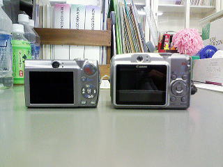 まずは、2つを並べたところ(写真は携帯電話で撮影)。当然IXYの方がかなりコンパクト。