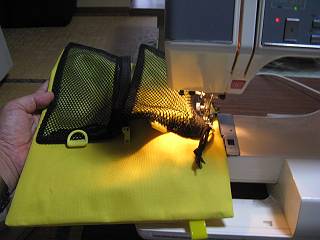 ポリエチレン系なので、接着剤ではつきそうになかった。ミシンで縫いつけることにした。