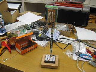 上側にLED基盤を2つのボルトで留め、下側には電池とブレッドボードを並べて置く。