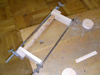取っ手も作ることにした。100円ショップで買った36mmの丸棒の両サイドを旋盤で15mmに削り、通しほぞにした。