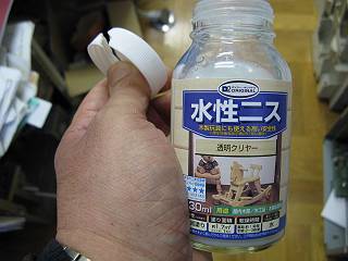 ウレタン樹脂塗装にしようと思ったが、閉店間際に飛び込んで、焦って取り上げたアクリル樹脂塗料の瓶を落っことしてしまいふたを割ってしまったのでこちらを購入。塗装面はちょっと柔らかいだろうけれど、まあこっちのほうが塗りやすいからいいか。