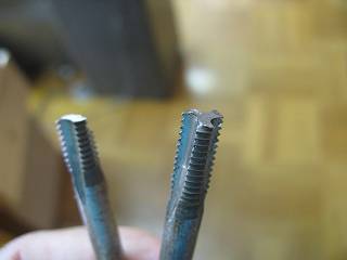 今回三年生で作っているマルチフォトスタンドのネジ部は8mmくらいの深さしかない穴なので、ぎりぎりまでネジを作るためにタップの先を落として,普通の上げタップ以上に先端までネジ部があるものにした。