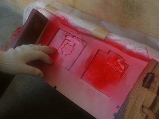 そこへスプレーをかけて色をつける。今回は赤にした。