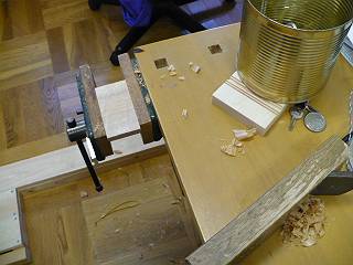 といっても、縦方向の板の木口にドリルで穴を開けるだけ。