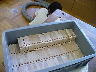全部で104個作ることにして、まずは縦の板を切り出してゴミ入れ用の穴を開けた。