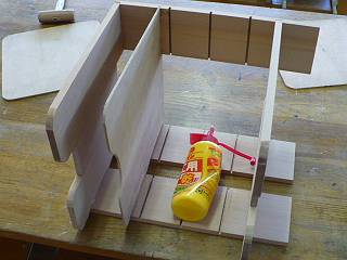側板も同じ材料で3本の柱として、棚板が入るように溝を入れた。