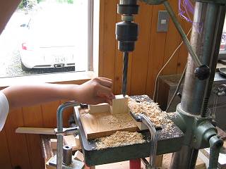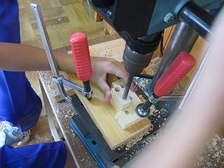 ペン立て部分は早く終わった生徒にボール盤どんどん穴あけをしてもらう。こちらは12mmのドリル。
