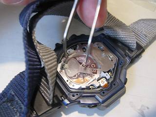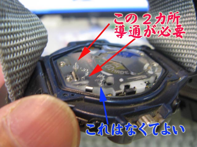 そこで,ダメ元で何とかやってみようと言うことでネットを徘徊すると,裏蓋とムーブメントをスプリングで導通させてやらないとだめらしいことがわかる。