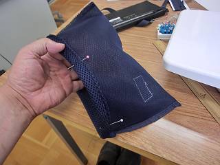こちらは、まち針で固定しただけでミシンをかける。まち針は外側に向けて打つのが基本とのこと。