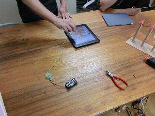 薄めの銅板でなければだめなのかな。その場での時間があまりなかったことと、自分ではipadなどの静電容量変化式のタッチパネル機器を持っていないので、これ以上の試行錯誤はできない。