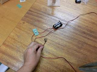 3Vのリレーに銅板を貼り付けて、スイッチにつなぎ、リレーの回路を閉じると銅板にアースが接続されるというもの。