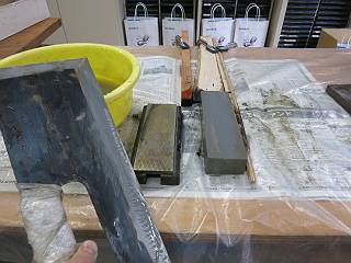 実は、この前に水研ぎ機でやってみたが、刃が長すぎて上手くいかなかった。結局全て手でやることにした。