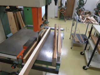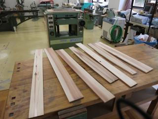 実験セットは木の枠に固定することにした。スギ材を10mm厚になるように、帯鋸で切ってかんなをかける。