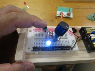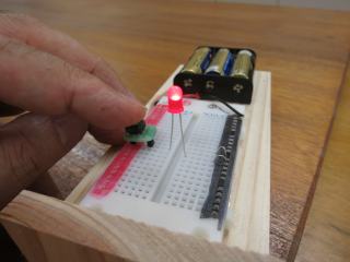 ブレッドボードにスイッチを差してチェック。ちなみにこのLEDは抵抗内臓なので、5Vでそのまま使える。