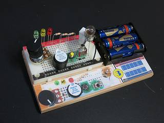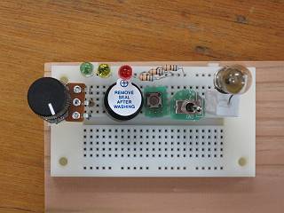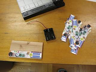 講座用とは違って、台座は一枚の板。収納時は部品を全部ブレッドボードに差した状態にすることにした。