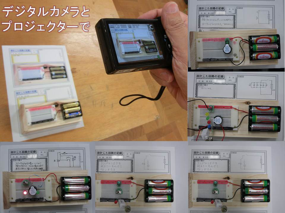回路の働きを考えて、ブレッドボード上に作成し、回路図も書いたところでデジカメにて撮影し、プロジェクターで共有して考えるというのが大きな流れ。