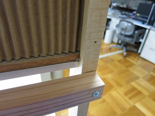 載せた名札掛けが滑って落ちないように両側の内側に木ネジを留めて突っ張らせる。