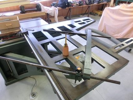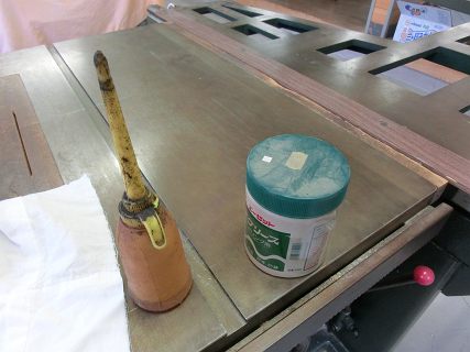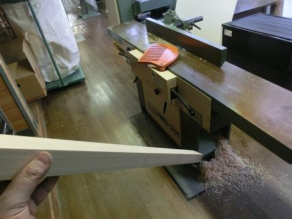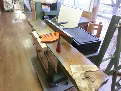枠板を取り付けなければならないので,手押し鉋盤を使う前に整備する。とはいってもメンテフリーのものなので,定盤に油膜をひいてテーブルの高さを調整しただけ。