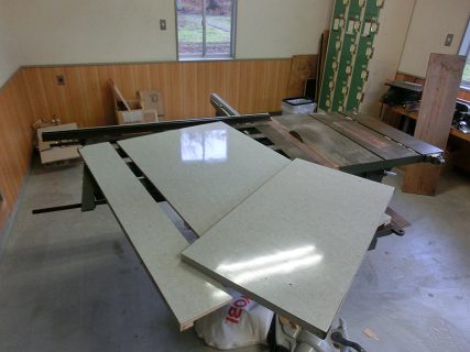 古い刃に戻して家に置いてあった化粧合板のパネルを切断してテーブルの天板にする。