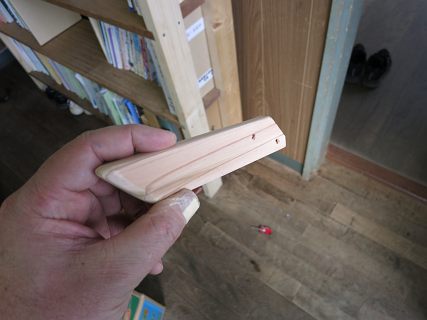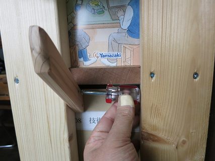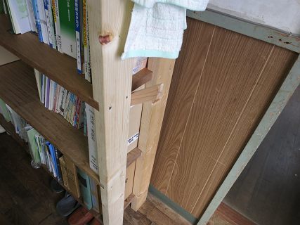 こちらも先日製作した本棚。横にフックを取り付ける。最初に付けておけばスマートだったけれどスタビードライバーが合ったので無事取り付けることができた。