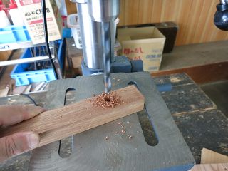 穴の縦位置についてはテーブルからの高さを測り、横の位置は今まで付いていた木と現物あわせで位置決めした。