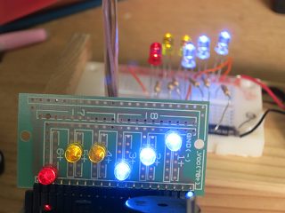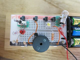 もう一つ変えたのは、豆電球の使い方。余った基板を切って抵抗のリードを切ったものでブレッドボードに安定してセットできるようにした。
