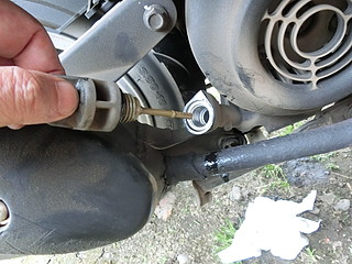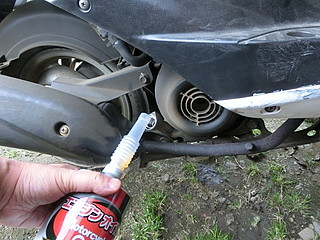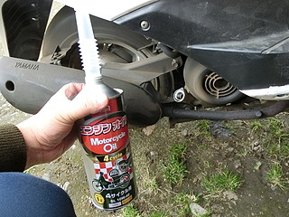 ホームセンターで買った汎用のエンジンオイル。オイルジョッキは使わず、延長の口を取り付けて流し込む。