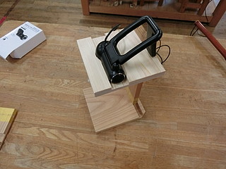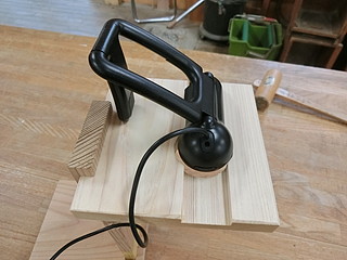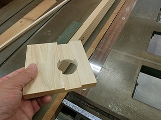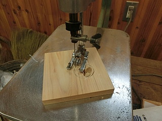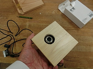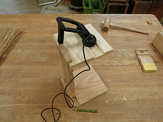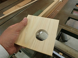 カメラ部分が大きいので、ひのき材に糸鋸で穴あけする。