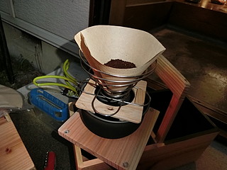 ドリッパーは滑るので、穴を開けた板に木を貼り付けてずれないようにした物を間に入れる。