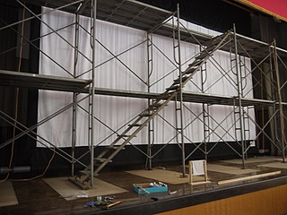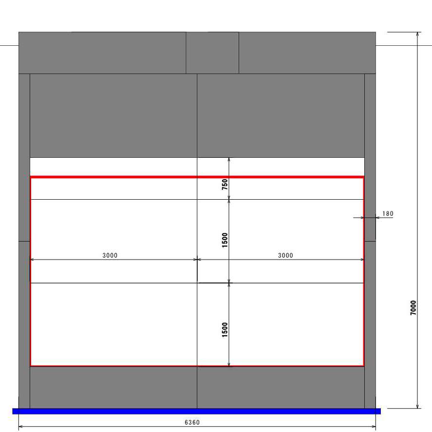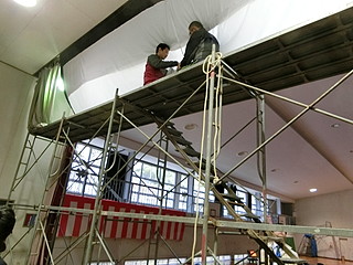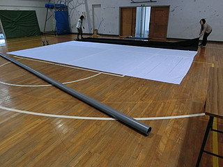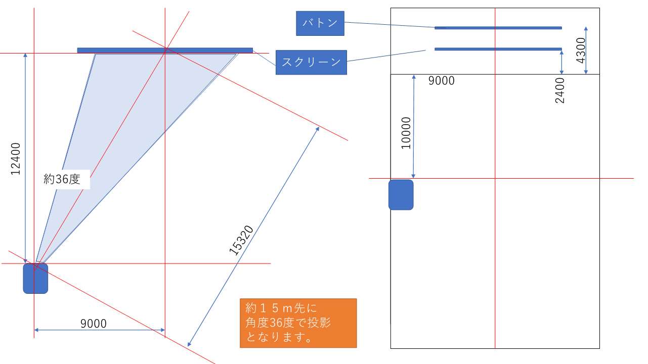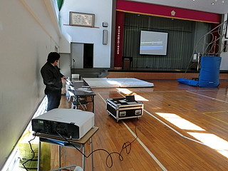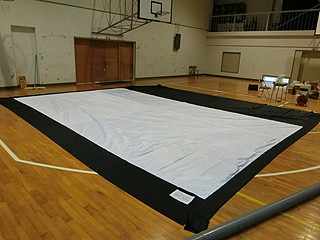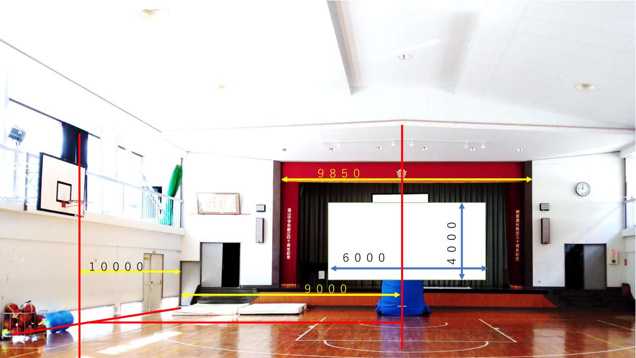 エプソンの7000ルーメンプロジェクターを借りてきてテストする。実際にはこの位置の真上のバスケットゴール構造材から投影する予定。