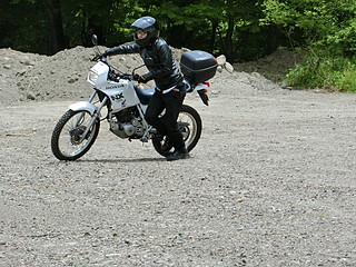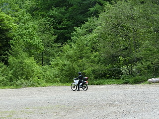 このバイクはキックスターターが省略されているので、押しがけをするしかなくなってしまった。そこからスタート。