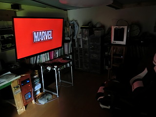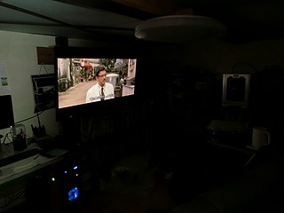 左側のモニターと机が普段の仕事用。映画館商用には右側に切り替えて使います。なんせ消費電力150wなので、映画のときのみ電源を入れます。