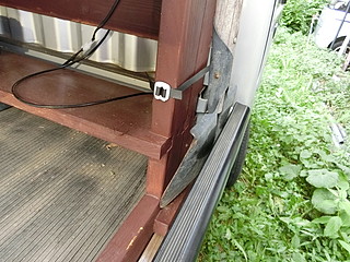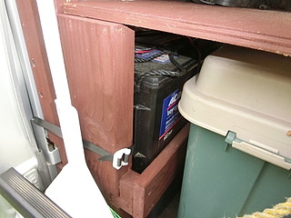 ウインチフックの固定も兼ねて、2段目の棚(大型ボックスを押さえつける)と太陽パネルの屋根にテンションをかけて固定している。