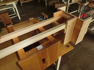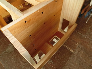 下に木材を大きめにつけて、現物あわせで脚を取り付ける。分解を考えてコーススレッドで留めるだけにした。