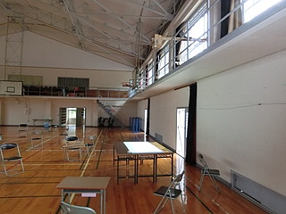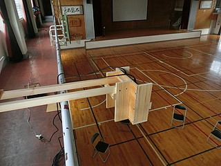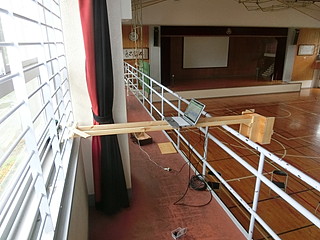 プロジェクタは普通のものなので、体育館のギャラリーからでないと大きさとピントのバランスが取れなかった。