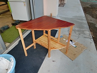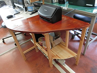 職員室の机配置を変更して以来、以前の設計で取り付けたコンセントボックスが邪魔でつい毛手しまう状態だった。残り材でテーブルを作ることにした。
