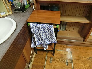 こんな感じでコーナーに設置、タオル掛けを棚からテーブルに移動した。