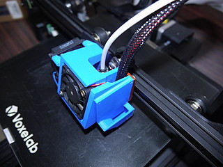 結局それでも同じ所で詰まる。何度も試行錯誤しながらホットエンドの上側の部分がきちんと冷却されていないことが原因かと言うことにたどり着く。ネットに後悔されていたデュアルファン用のヒーターブロックカバーをもう一つの3Dプリンタで印刷して利用してみると、シングルファンでありながら上手くいった。やはり上部の冷却が不完全だったためにPLAが上の方で溶けてしまって詰まったのが原因であると考えられた。
