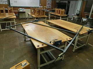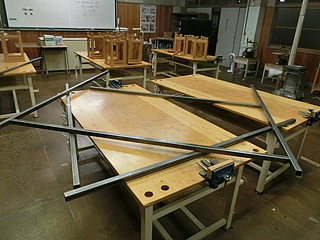 小学校には動力の電源も溶接機もないので、前任校の中学校で機材を借りて溶接をする。