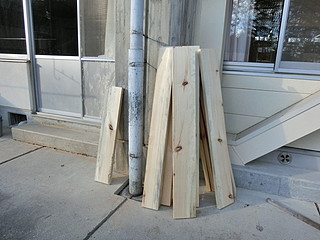 製材して乾燥機にかけてもらった材が届いたので、机の長さに切断して、よいところを取り出す。